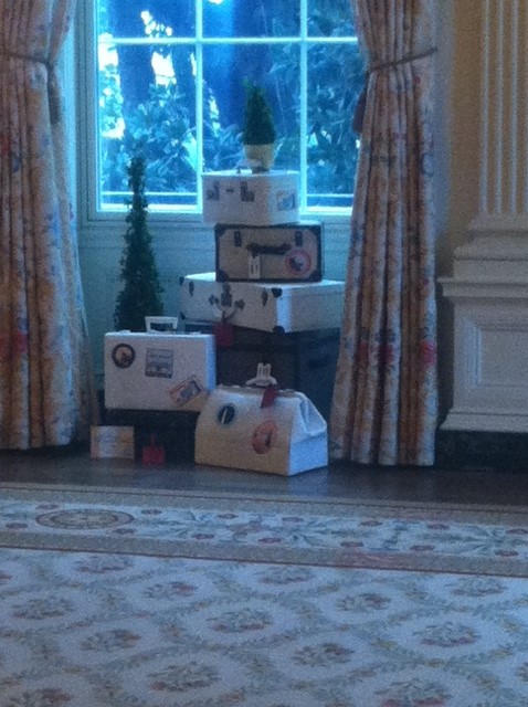 I also loved the vintage luggage pieces in the window bays of the State Dining Room, which were painted a silvery-white and dusted with glitter and gold trim.